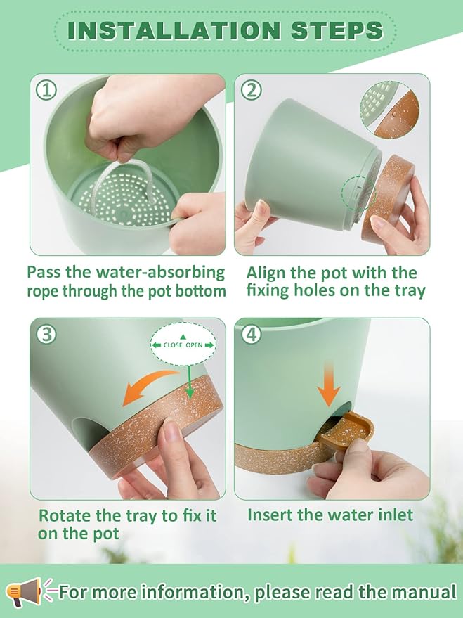 - 【Detachable Watering 】Our self-watering flower pot includes a free removable watering inlet for easy watering. You don't have to pick up the heavy pot from the reservoir anymore, just align the watering and you can quickly fill the water into the reservoir tray, avoiding the problem of water seeping from the bottom of the pot every time you water. The product includes instructions, you can refer to the instructions to install the watering inlet.