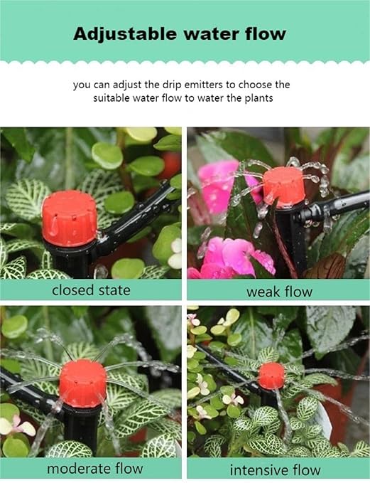 - Adjustable Drip Emitters: you can adjust the water flow mode and sprinkling distance until a complete shut-off by rotating the cap. And the dripper cap can also be opened for easy check and cleaning