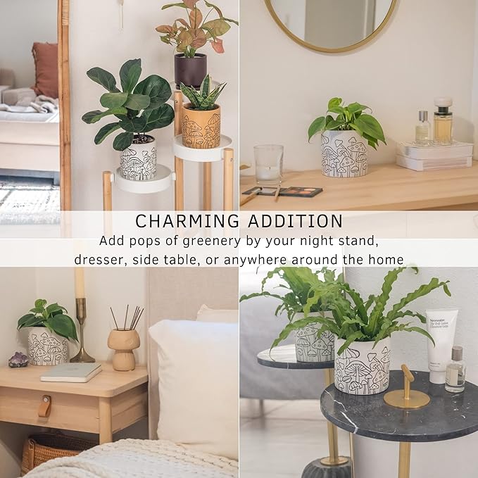 - Mushroom Planter with whimsical etched design all around. Fun and quirky decoration sure to make a cottagecore statement. Holds small indoor plants, fresh flowers, and succulents