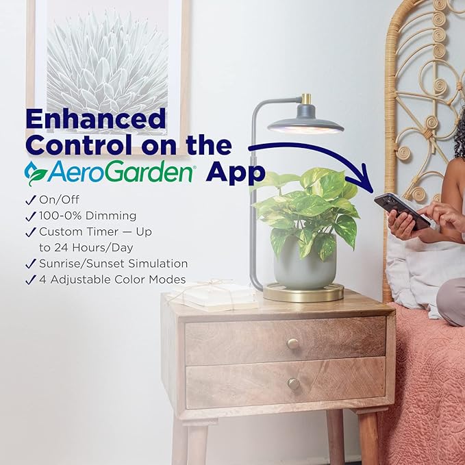 - Easily customize your smart grow light via the AeroGarden app, with features including custom light schedule, dimming capabilities, sunrise/sunset setting, and four adjustable Light Modes