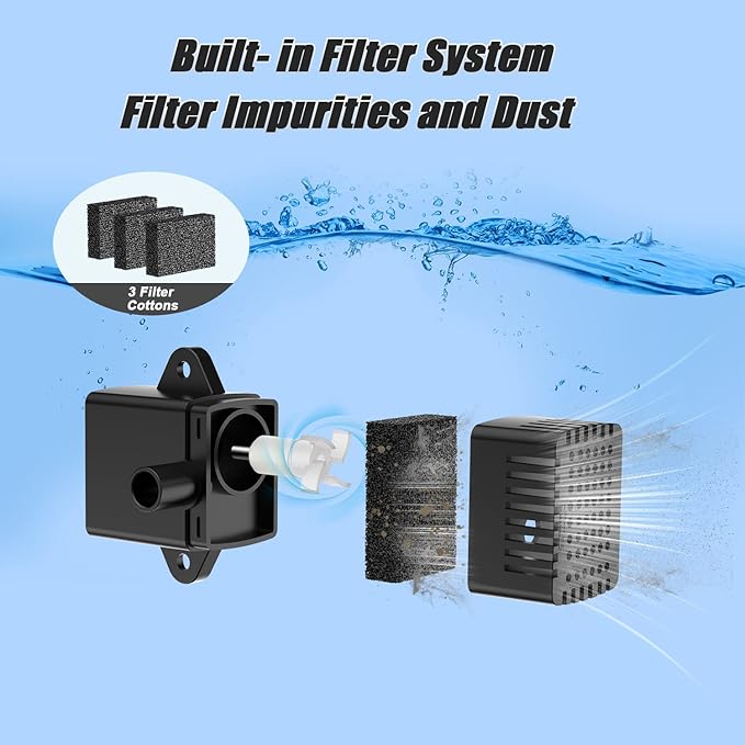 - Blocking Protection System: Solar powered fountain comes with an anti-clogging technology, it will stop working automatically when the filter cotton or rotating shaft is blocked in the direct sunlight; Tips: If the solar fountain stop working, please clean the filter cotton and rotating shaft; Please do not put the solar fountain in a place where there is no water and the sun shines directly to avoid dry working