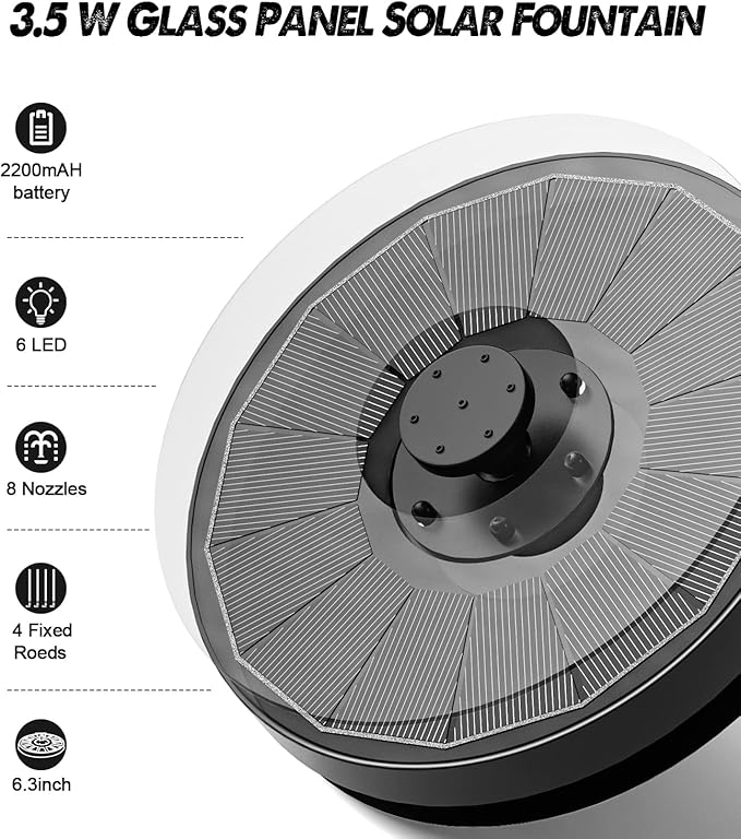 - White LED Lights Solar Fountain:3.5W solar water fountain for birdbath is equipped with 6 LEDs; The white led light will auto light up at night; With 2200 capacity battery, the solar fountain with battery fully charge will provide power for about 3 - 4 hours working at night; During the day, the solar fountain will attract all kinds of birds, like hummingbirds; At night, you and your family can enjoy the wonderful light show; Go and buy our amazing solar fountain with white light to decorate your Garden
