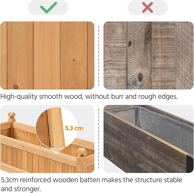 - SINGLE-PIECE SIDE PLATE -- Comparing with other planting beds with several small wooden plates at the side, our planting raised bed has a whole side board at each side. It is fixed firmly without leakage of soil. The entire structure is very stable, and the installation is effortless
