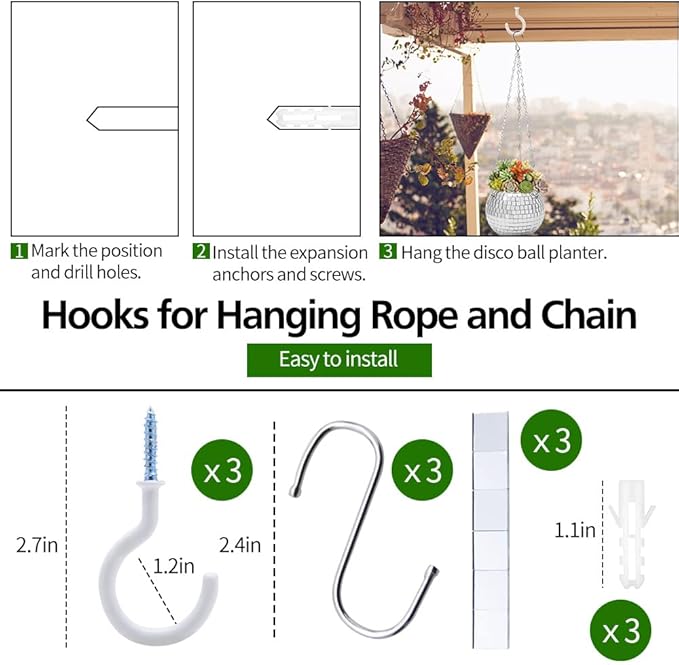 Disco Ball Planter, 8"+2×4" Planter, Silver Planter, Disco Ball Plant Hanger with Hanging Rope, Hanging Chain, Hook, Circle and Extra Mirror Pieces (8"+2×4" Silver)