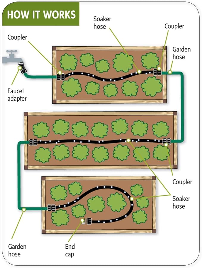 - GREAT FOR GARDEN BEDS IRRIGATION--This soaker hose kit can water three garden beds at once.soaker hose are laid around the roots of the plant, and garden hose can be connected to soaker hose in different beds.