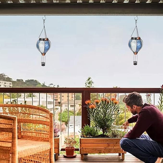 - 【Unique Hot Air Balloon Design】--This hanging solar light is composed of 8 pieces of blue and white glass with lifelike flame lights. As night falls, their glow adds warmth and comfort to your garden, patio, yard, path, and more. great Christmas decorative lights.