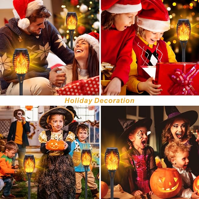 - Upgrade Solar Torches Lights with Flickering Flame: Mini-Size 12LED solar lights outdoor cast a gorgeous, soft, vivid and safe glow, which provide a charming campfire atmosphere for your family. Solar torches are suitable outdoor decorations for patio, garden, yard, porch, making your garden stand out in the community