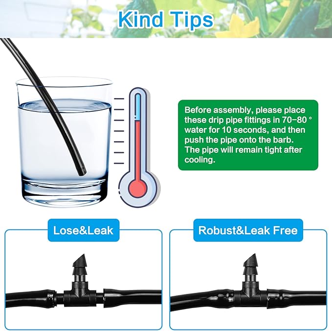 - 【Easy to Install】: The drip tubing parts are designed with barbs. Before assembly, please place these drip pipe fittings in 70-80 ° water for 10 seconds, and then push the pipe onto the barb. The pipe will remain tight after cooling.