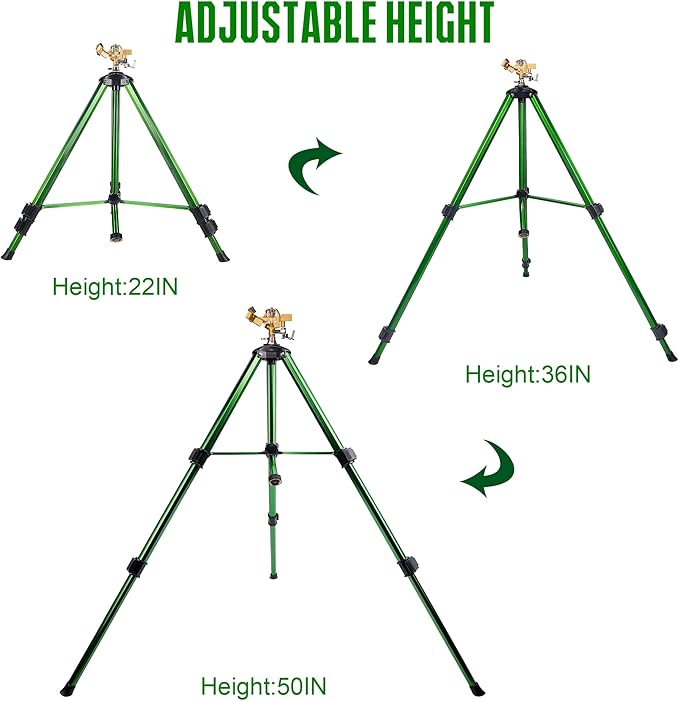 - SUPERIOR QUALITY: Our tripod garden sprinkler can extends up to 50 inch, is made of high quality material. Heavy duty brass sprinkler head and solid alloy metal tripod look polished and robust very sturdy, rust-proof for a long term use