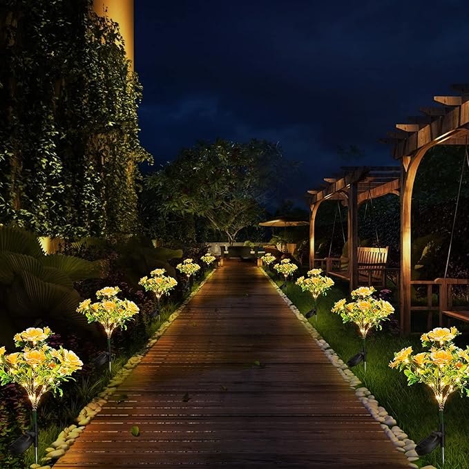 - ☔【Waterproof and Temperature Resistant Solar Light Flower】Neporal solar garden lights are IP65 waterproof and made of plastic and aluminum materials. Aluminum alloy stake firmly holds the solar lights on the ground to avoiding breaking and missing in windy weather, and The garden solar lights can fearless blooming in hot, rain, cold and frost, without worrying about the various bad weather.