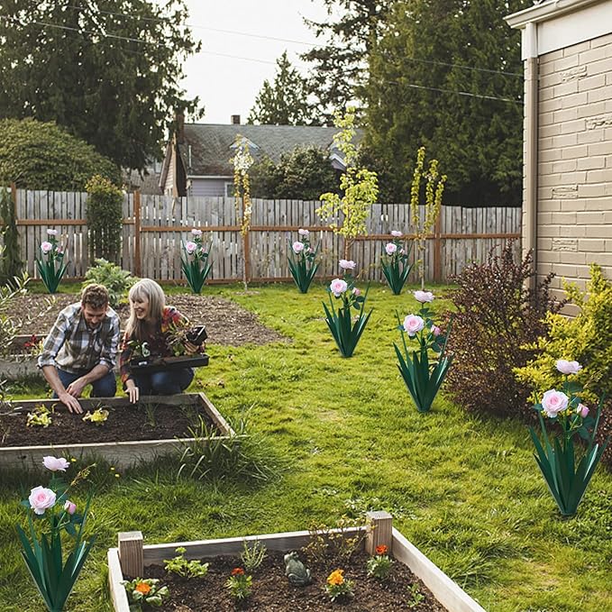 - Both stem and leaves are supported by wire for superior flexibility and durability. These flower bed decorations will bring you outdoor decorating solutions with solar garden lights. Suitable for planting near trees, flower beds, fences, cemeteries, graves and walkways.