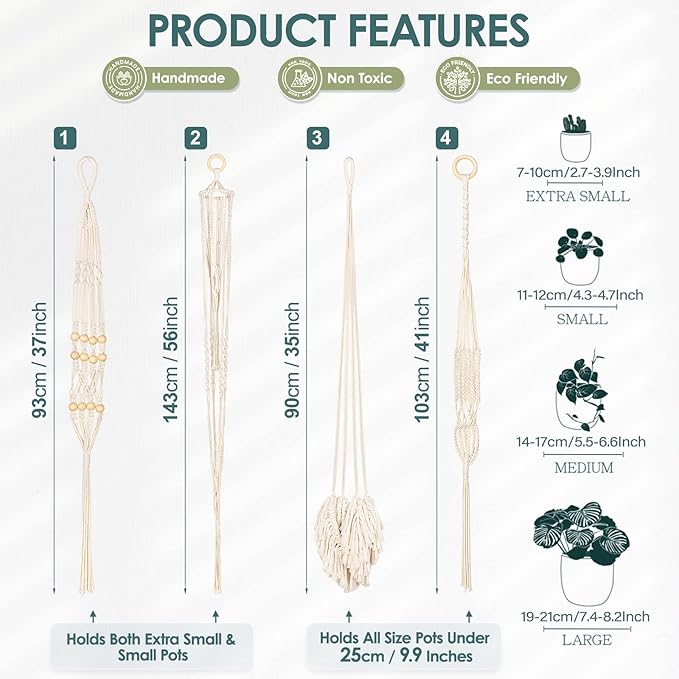 - EASY TO INSTALL & VERSATILE: No assembly required, the boho hanger set comes ready to use. For using, you can just hang it on a sealing hook, wall hook, curtain rod or anywhere you would like it to be. Double tier hanger and wooden bead hanger only holds small pots under 4" in diameter; Fluffy tassel hanger and classic hanger can holds pot or bowl size under 9.9 inches in diameter. Please check the pot size before you make a purchase.