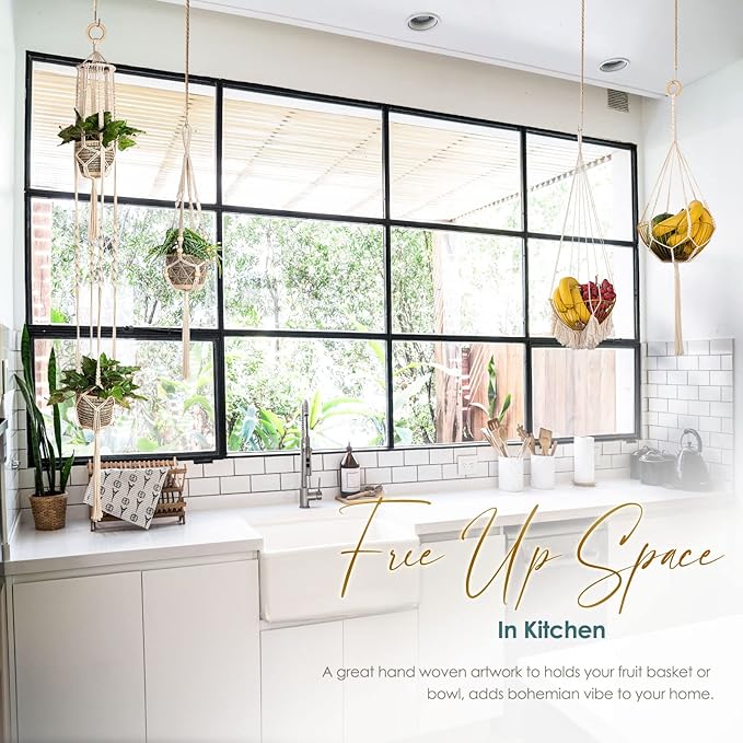 - FREE UP CORNER SPACE: Macrame plant hangers are the perfect small space solution because they can be hung on the wall or from the ceiling, freeing up shelf space for other things. Also, A great hand woven artwork to adds bohemian vibes to your home, kitchen, nursery, indoor garden, bedroom, living room, dorm, offices, studio and so on, brings a unique decorative piece to style your space and great way to show your plants, create your own urban jungle.