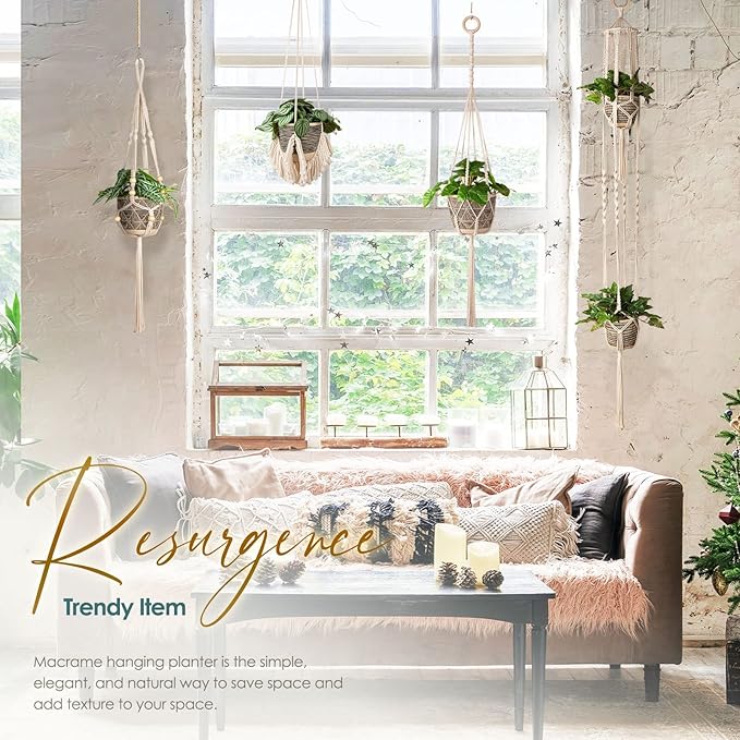 - RESURGENCE TRENDY ITEM: If you’re looking for a unique simple decorative piece to highlight your greenery and saving space, here’s the perfect solution for you. Macramé hanging planter is the simple, elegant, and natural way to save space and make life that little bit easier. The hanging ring we use is an unfinished natural bamboo hoop, the net is woven by hand from a unbleached and unpolished cotton twine.