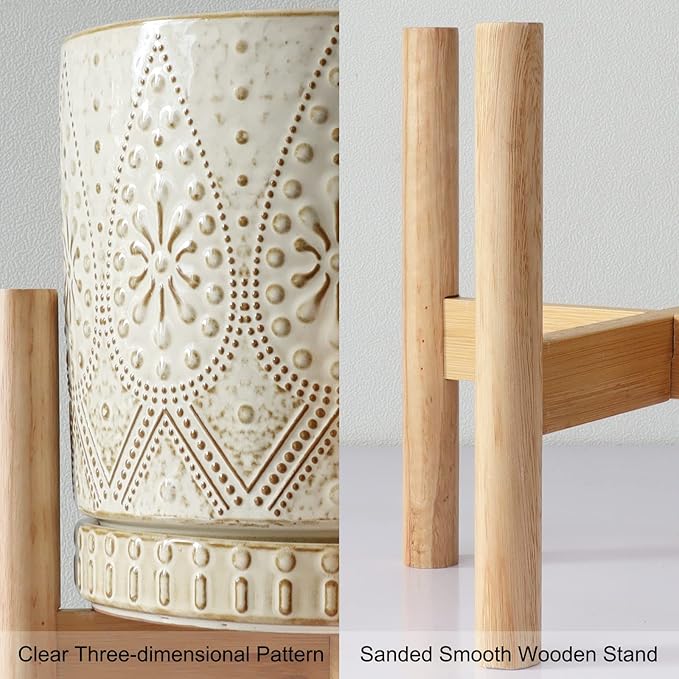 8 Inch Plant Pot with Stand, Ceramic Planter with Drainage Holes, Saucers and Mesh Pads for Indoor-Outdoor Plants