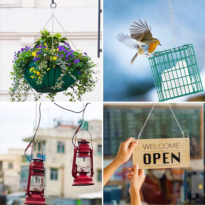 - Wide Application: Hanging basket chain with hooks endless uses. Decorate your outdoor and indoor, The gold chain hooks for hanging plants、bird feeders、bird houses、plant baskets、flower pots, lanterns、wind chimes、christmas lights、christmas hanging basket、stained glass、ceiling、shooting targets、isle markers etc. Tips:Each of our chains has 2pcs S hooks, which make the suspension stronger and safer.
