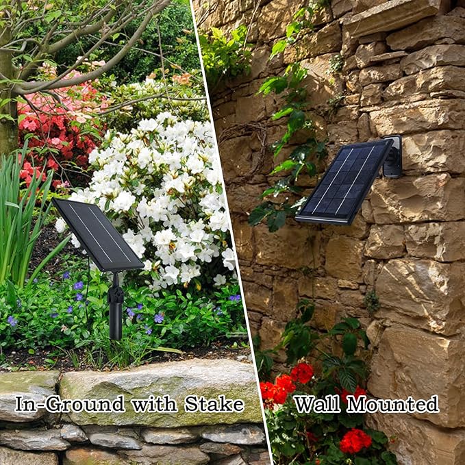 - 27 ft Long durable solar string lights with 12 led bulbs. 19 inches between bulbs, 9.5 feet from solar panel to the first bulb. The solar powered panel can be mounted in-ground with stake or wall mount by screws, accessories for both settings are included
