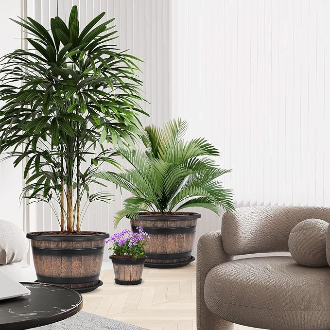 Quarut Plant Pots Set of 3 Pack 9 inch,Whiskey Barrel Planters with Drainage Holes & Saucer.Plastic Decor Flower Pots Imitation Wine Barrel Design,for Indoor & Outdoor Garden Home Plants (Brown)