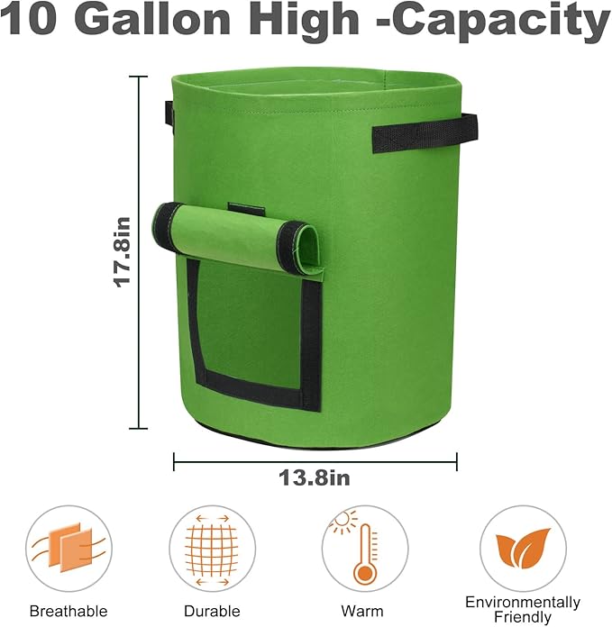 - [Breathable & Durable Material] Garden Planting Growing Bag Made of breathable & durable non-woven fabric, Thickened Non-woven Fabric plant grow bags which is heavy duty felt, planting bags can ensure rapid drainage and provide an ideal growth environment for plants' moisture, nutrition and temperature.Reinforced handles can bear more weight and ensure that they can support a full bag of soil.