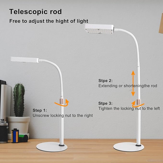 - 【Stable Base and Adjustable Height Stand】This desk grow light with base and stand, you can stand it on desk and adjust the lamp head height according to your application from 16” to 24”.