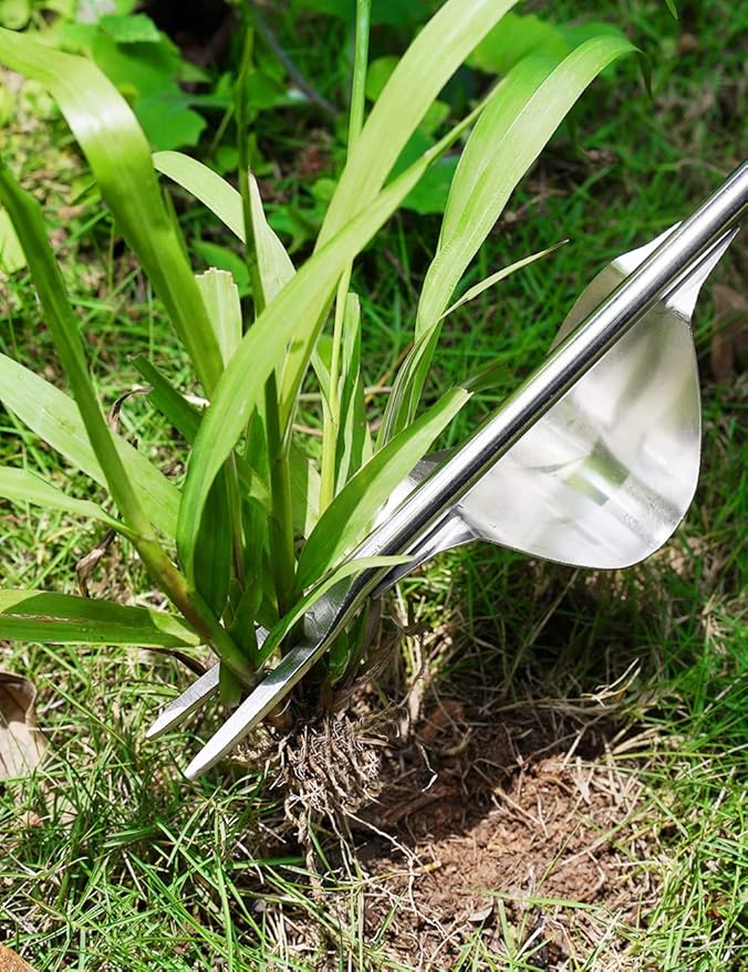 - L-shape and Fork-shape Design: The edges of the weed removal tool use the L-shape and fork-shape design to scrape stubborn grass off quickly. They are sharp so be careful to use them.