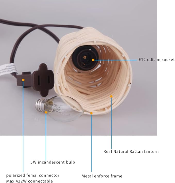 - Connectable wicker Lantern String Lights: The total length 10ft with polarized plug and connector.End-to-end up to Maximum 432 watts total.