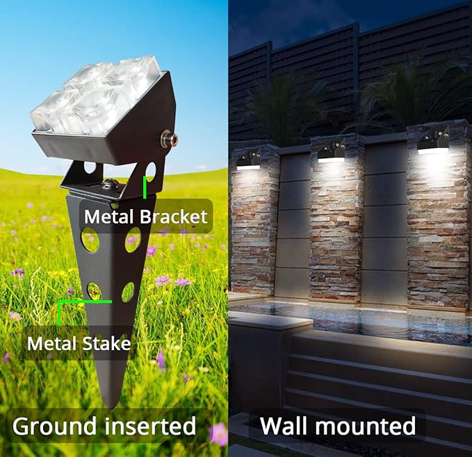 - 【IP65 Waterproof & Easy Installation】The Solar Outdoor Light head is sealed by silicon glue, completely waterproof for outdoor use, stick into the ground with the metal stake as landscape lights, or mount on the wall with the screws as wall lights, optimum for Patio, Porch, Path, Deck, swimming, pool, Yard, Garden, Garage, Driveway, Pathway, etc landscape lighting.