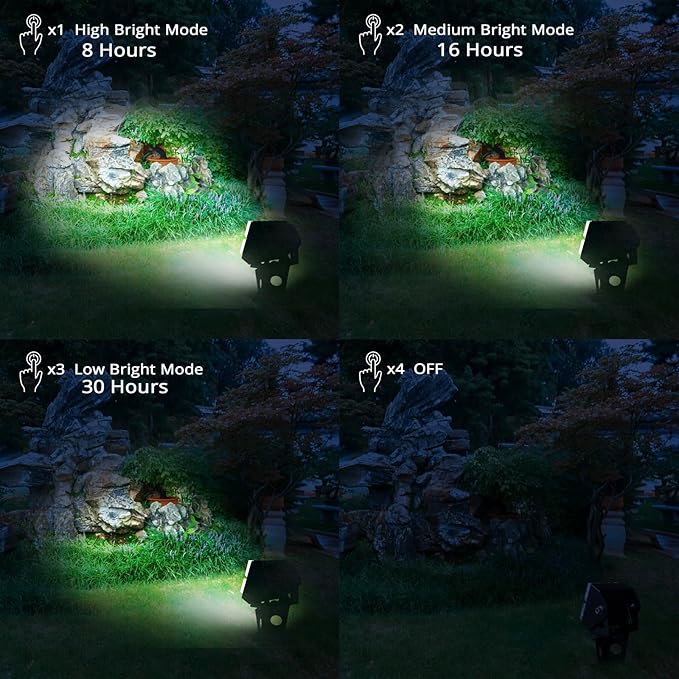 - 【Auto ON/OFF and Dusk to Dawn】The Solar Landscape Light comes with separate solar panel, the cable from solar panel to the first spotlight is 16.4ft, can install the solar panel where can absorb max sunshine. The garden light will turn on in the night and turn off in daytime automatically. 3 power modes(High/Mid/Low) can meet different usage requirements. Large capacity battery ensures the light can work from Dusk to Dawn when battery is fully charged.