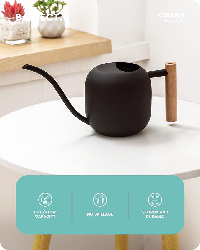 - Elegant appearance - This indoor plant watering can features a drum-like metal body in matte black with a wooden handle for comfortable grip. You can place this elegant garden watering can on your indoor plants shelf as a decorative ornament.