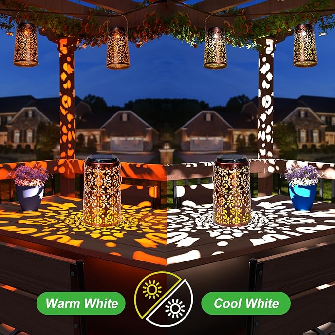 - Beautiful Pattern - Perfect Outdoor Decor: cute solar outdoor lantern with unique hollowed-out design. You can hang it on the porch, tree, pergola with the hangring, or placed on the tabletop, lawn, ledge. Present a vivid pretty pattern on the table or the ground, make your patio special. Perfect for garden, yard, backyard, pathway, walkway, courtyard, terrace, balcony, home decoration and as a unique gift for any occasion like Easter, Christmas, Wedding, Party, Halloween, Birthday, etc.