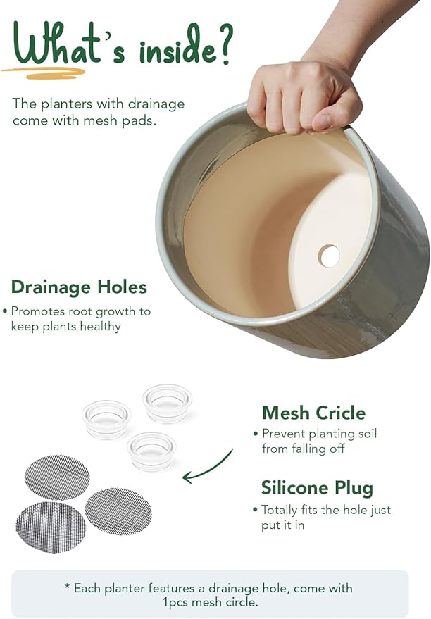 - Thoughtful Accessories: To drain or not to drain, it's all up to you; roots love moisture but are afraid of excessive water; use a silicon plug to prevent water leakage, or cover the drainage hole with a mesh pad to prevent soil loss, offering good ventilation for plants to breathe without restriction (Plant is NOT included)