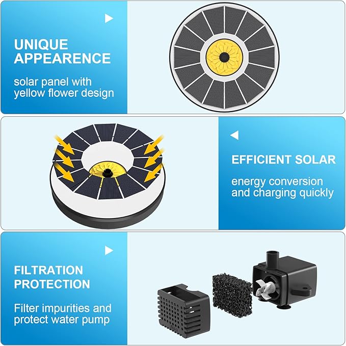 - Innovative Fixing Device:Our solar water fountain comes with four specially designed fixing devices that prevent the pump from drifting and spraying water outside of the bird bath,reducing the frequency of refilling water