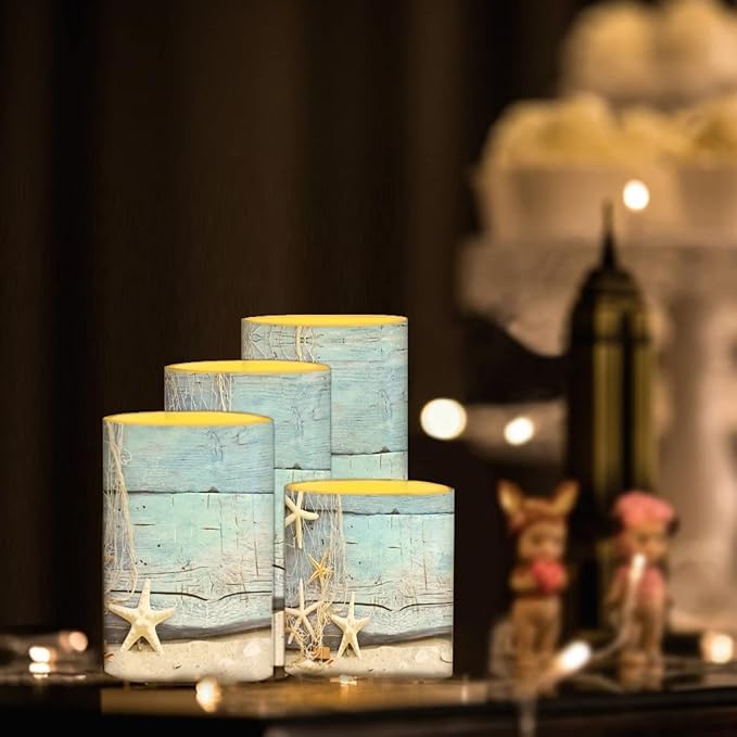 Flameless Candles 4 Pcs, Battery Powered with Timer Remote Control Color Changing Everlasting Pillar Candle Set Indoor Outdoor Coastal Decor, Beach Starfish with Blue Wood Grain