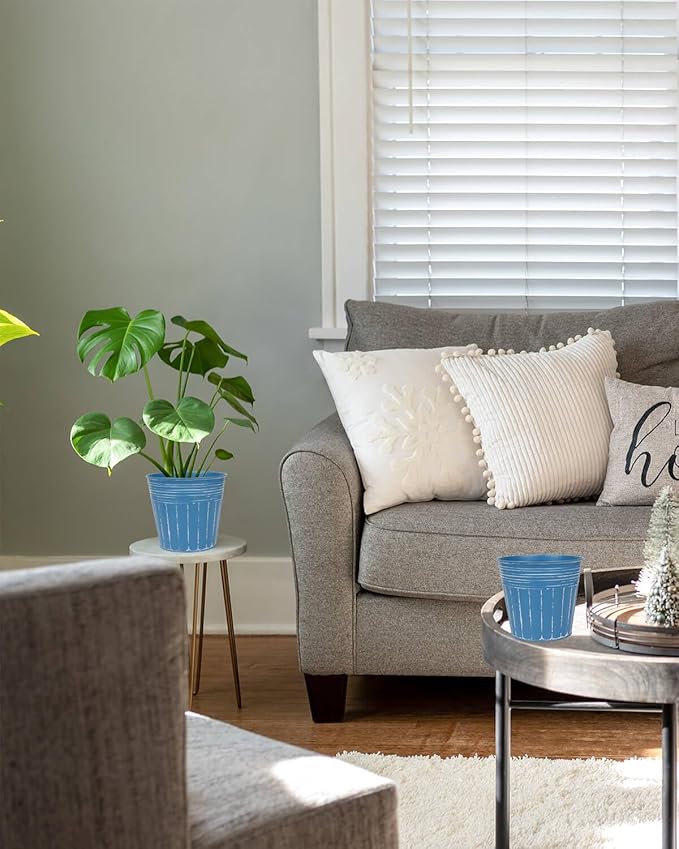 vensovo 5 Inches Blue Metal Rustic Flower Pots - 6 Pcs Small Galvanized Planters with Drainage Hole and Rubber Plug, Rustproof Tin Bucket Plant Pot Farmhouse Vintage Style for Decor