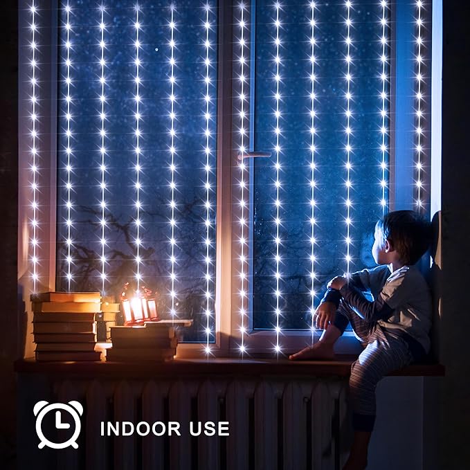 - 8 Modes & Timer Function: With 8 different modes to choose from, including fireflies flashing, waves, fading, chasing/flashing, and more, you can customize the lighting to suit any occasion. Plus, the built-in timer ensures that the LED curtain Christmas lights turn on at dusk and turn off automatically, saving energy and hassle.