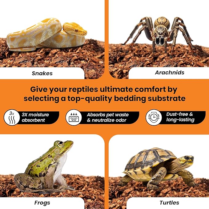 • 🥥Reptile & Amphibian Bedding: Upgrade your pet's home with our top-notch reptile bedding substrate. It absorbs moisture three times better than regular types, keeping your pet's home dry and comfortable. It has excellent capacity to absorb waste & eliminate odors. Perfect for all types of reptiles, arachnids & scorpions