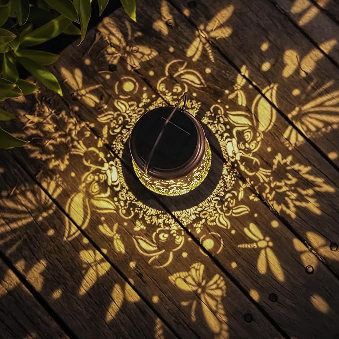 - Graceful Decorative Design - The retro appearance, with gold copper color and hollow out metal veneer, the solar outdoor lanterns casts bright and warm light in darkness, accompanied by gorgeous and graceful bunny dragonfly butterfly patterns, adding a beautiful atmosphere to the surrounding environment.