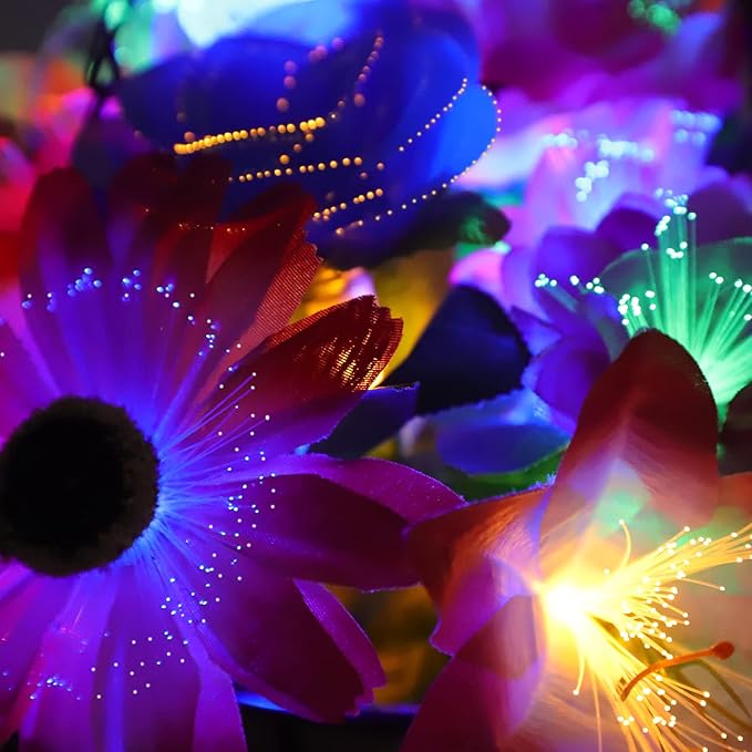 - VARIETY OF FLOWERS:This set of landscape lighting flower baskets includes 18 highly realistic fiber optic flowers, consisting of 4 hot pink flowers, 3 pink flowers, 3 phalaenopsis flowers, 2 lilies, 2 roses, 2 small daisies, 1 sunflower,1 peony flower and Bottom simulation rattan. It also comes with a butterfly and hummingbird decoration, a solar cell for power supply, a flower basket for display purposes and a simulated lawn foam base for stability.