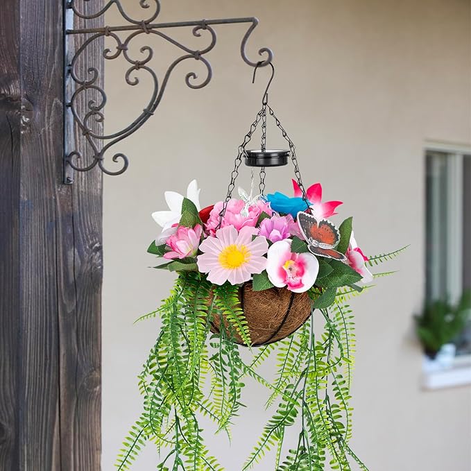 - LIGHTING ARTWORK:During the day, the garden is adorned with a plethora of exquisitely crafted flowers, fluttering hummingbirds and delicate butterflies. As night falls, solar lamps emit a kaleidoscope of vibrant hues, transforming the garden into an enchanting illuminated flower basket.
