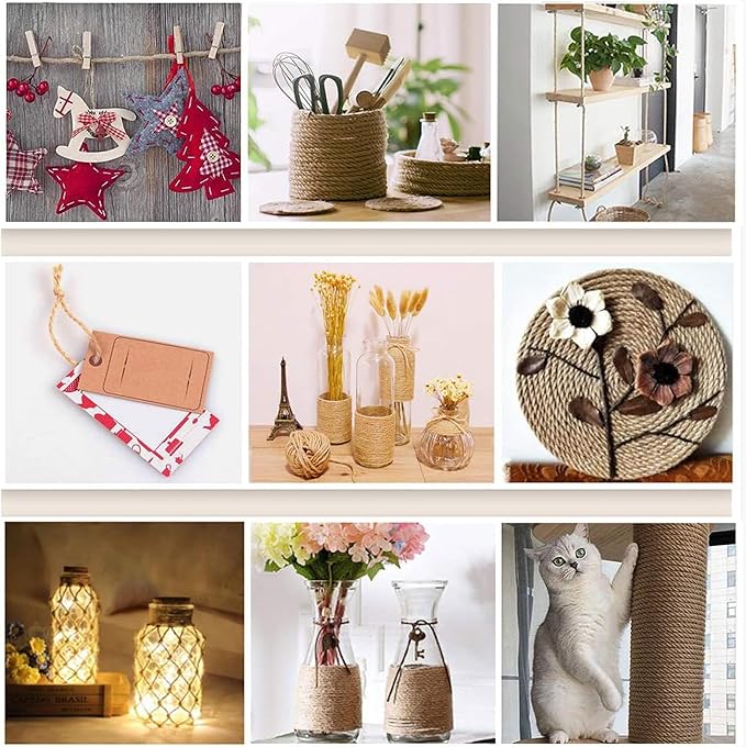 - 【Decorative and Diy】 Craft The Jute Twine string is widely used in everyday life. For gift wrapping or art DIY crafts ,make discarded empty bottles into beautiful handmade vases. You can also use it to hang photos,bottles,Mason Jars,wedding and party favors,making bouquets etc.Use it to bind plants to give them strong support and better growth. The multi-function jute rope twine will bring you many benefits and surprises
