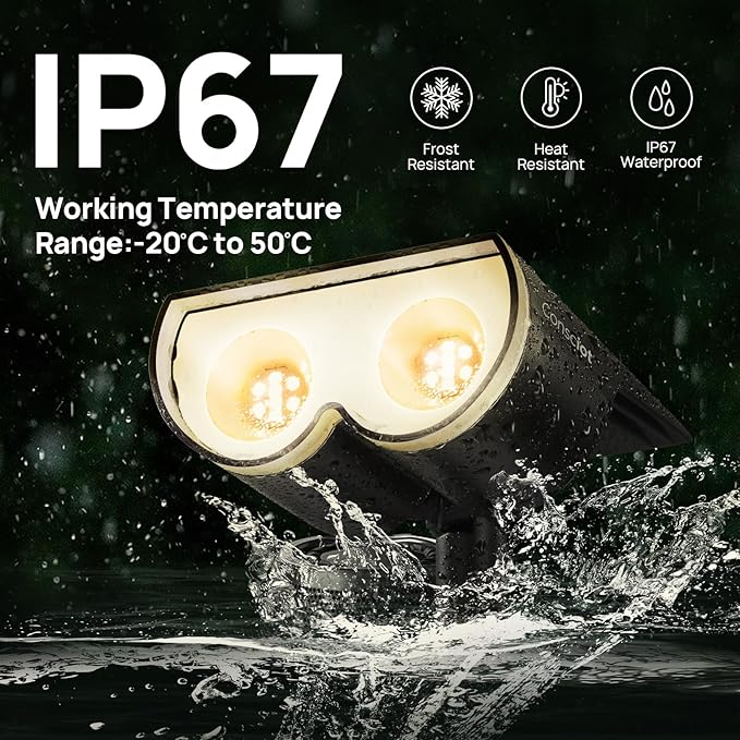 - [IP67 Waterproof & Durable] : IP67 waterproof, Heat Resistant and Frost Resistant, no matter it rains, snows, frost, high heat or other extreme weather, you can use the solar landscape lights at ease. Made of high-quality and premium ABS material, closely fit to form a seamless light head, leaving no chance for the rust and water to erode the light, solid and durable enough for longer lifespan.