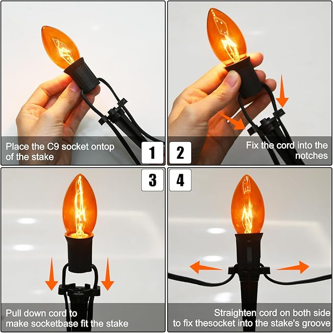 - Safe and Energy Saving: Halloween decorations walkway lights with 10 C9 clear orange black bulbs, E17/C9 intermediate socket base, 7W incandescent bulb, halloween garden stakes light UL Listed for indoor and outdoor use. If a light bulb that goes out does not affect other lighting bulb. Tips: A spare fuse stored in male plug.