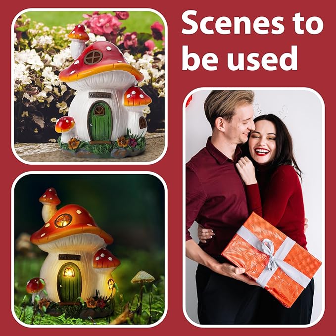 - Mushroom House Garden Figurines: The large outdoor figurine is 8 ¾” tall, 7” wide, and 5 ¾” deep. This unique mushroom house will add whimsy and color to your garden.