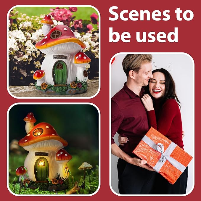 - Mushroom House Garden Figurines: The large outdoor figurine is 8 ¾” tall, 7” wide, and 5 ¾” deep. This unique mushroom house will add whimsy and color to your garden.