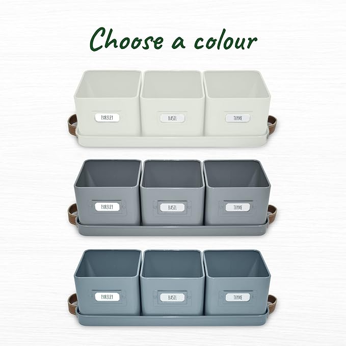 - 🌻 【 Space-Saving 】 Enhance your kitchen herb garden with our 3-pack Grey indoor herb pots (4.1" x 4.1" x 3.9"). Includes 5 printed and 5 blank cards for organization, a 4.3" x 13.8" x 1" tray, and pots with drainage holes. Perfect for a lively, fresh-scented windowsill garden.