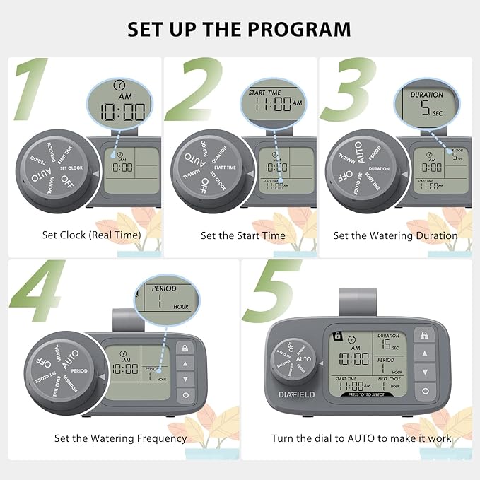- Adjustable & Precise Plant Care:This water timer can adjust watering duration effortlessly, ranging from 5s to 90s for shorter bursts, or 2mins to 15mins for deeper hydration. Tailor the watering frequency to perfection, with options from 1h to 23h for frequent care or 1 day to 30 days for longer intervals. Experience the ultimate flexibility in nurturing your plants, ensuring they receive the optimal hydration they need to thrive. Gardening has never been this convenient and efficient