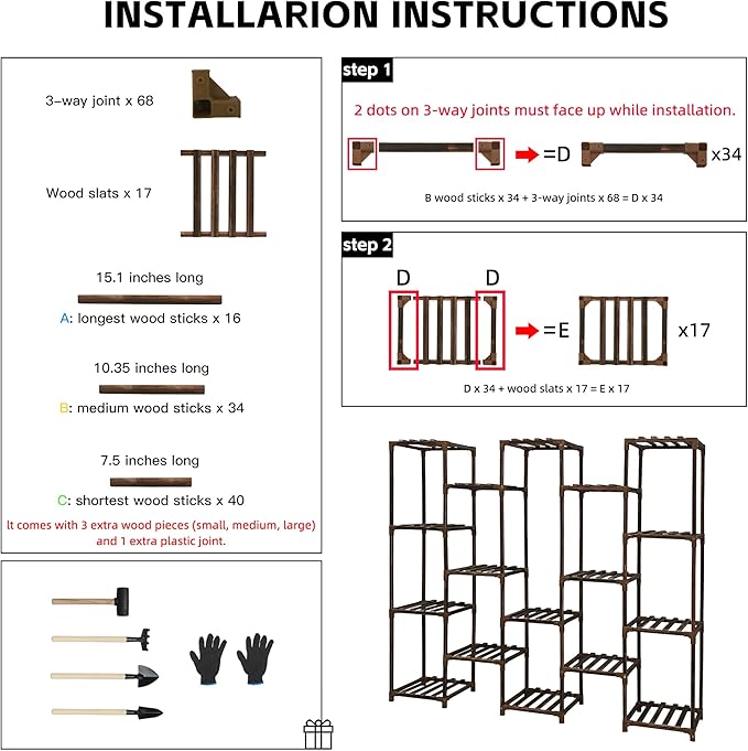 - DIY Assemble: The package has lots of wood pieces and connectors, you can follow the installation video to assemble or design the plant rack(video is in the last picture of the product page). Make sure to wear attached gloves to keep the wood stains off your hands. It comes with 3 extra wood pieces (small, medium, large) and one extra plastic connector. Ps: 2 dots on all joints must face up during assembling. Wrong direction may cause pieces do not fit together.