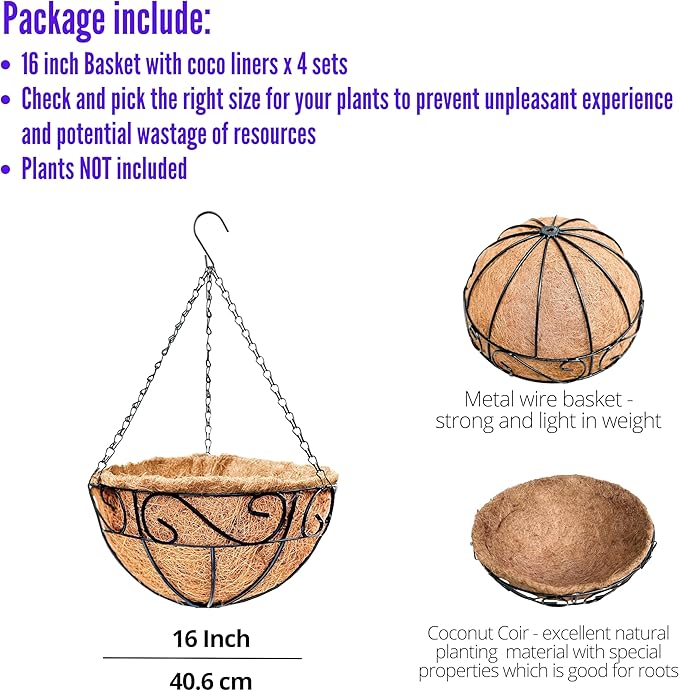 - 4-PACK SET, 16 Inch, mini size. Pick the right size for your plants to prevent unpleasant experience and potential wastage on resources. Flowers and Plants are NOT included. These metal hanging planters are ready to hang with hanging chain and hook. Assembly not required