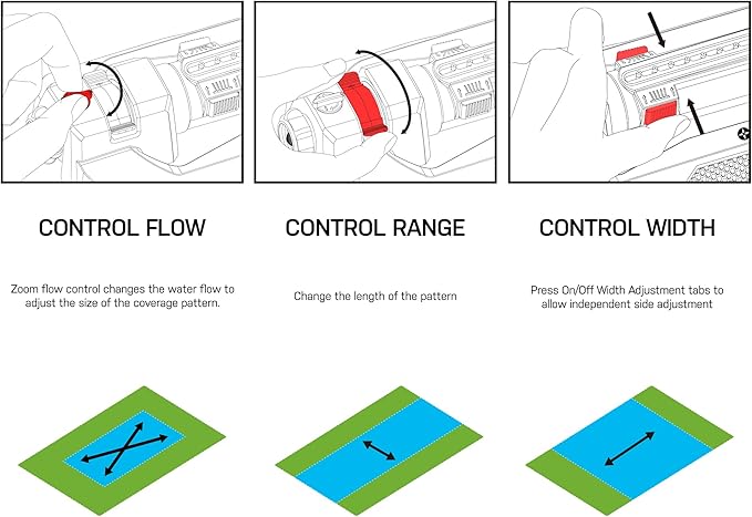 - Width adjustment tabs are easy to customize watering from a wide area to narrow spray path