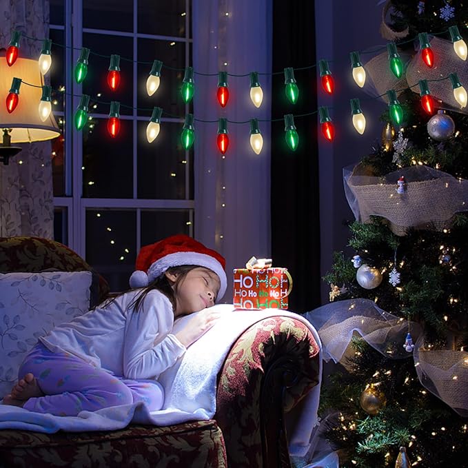 - 🌟 Versatile Application: C7 led Red white and green christmas decorations lights glow a warm white lights, vintage Christmas light string is dimmable, lights dimming requires a dimmer. c7 led christmas lights can be used both indoor and outdoor, such as the bedroom, bar, window, Christmas tree, party, wedding, window, holidays, festivals, shows, restaurants, hotels, shopping centers, patio, or porch, pathway, roofline decorations and lightings